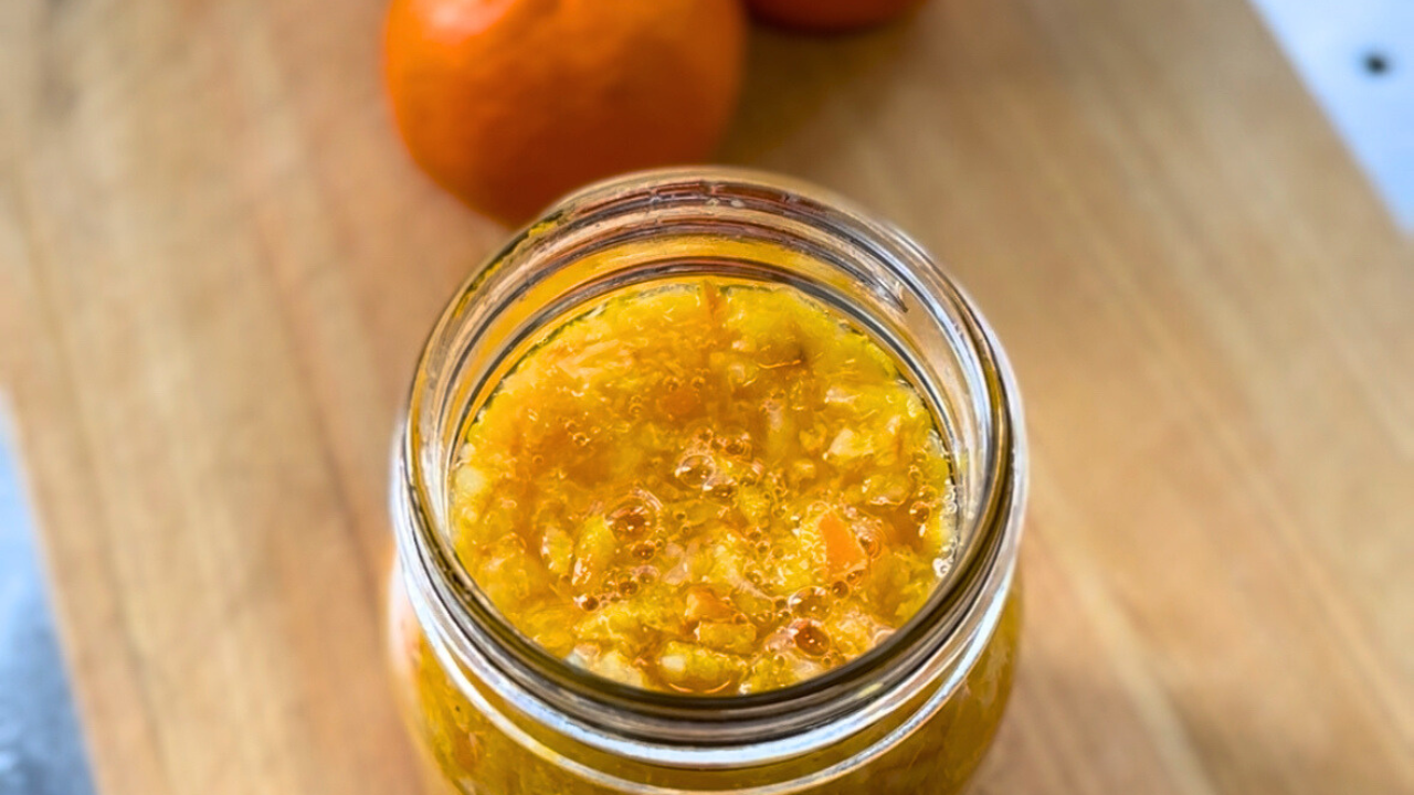 8.煮沸消毒しておいた瓶に(7)、クレメンティンの皮、みじん切りした白い房を入れて出来上がり。